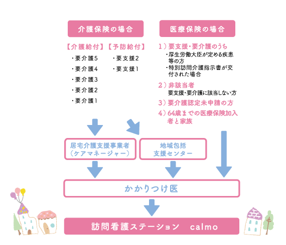 訪問看護は、介護保険・医療保険のサービスをご利用いただけますが、いずれも、かかりつけ医の指示書が必要となります。